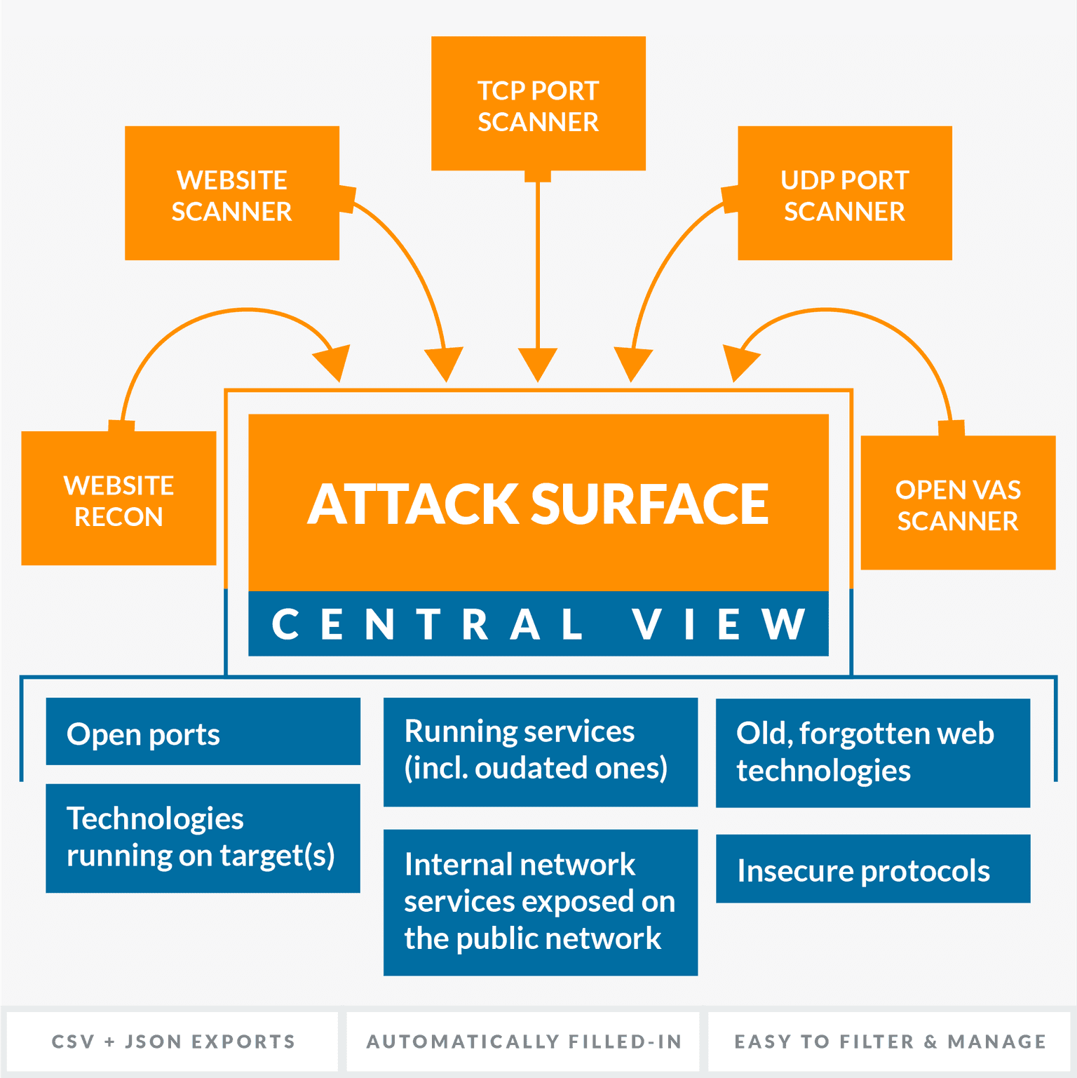 The Attack Surface pulls data from the following scanners: Website ReconWebsite ScannerTCP Port ScannerUDP Port ScannerOpenVAS Scanner, and aggregates scan results in a unified, centralized view. (Yes, we’ll add support for more tools in the future!)