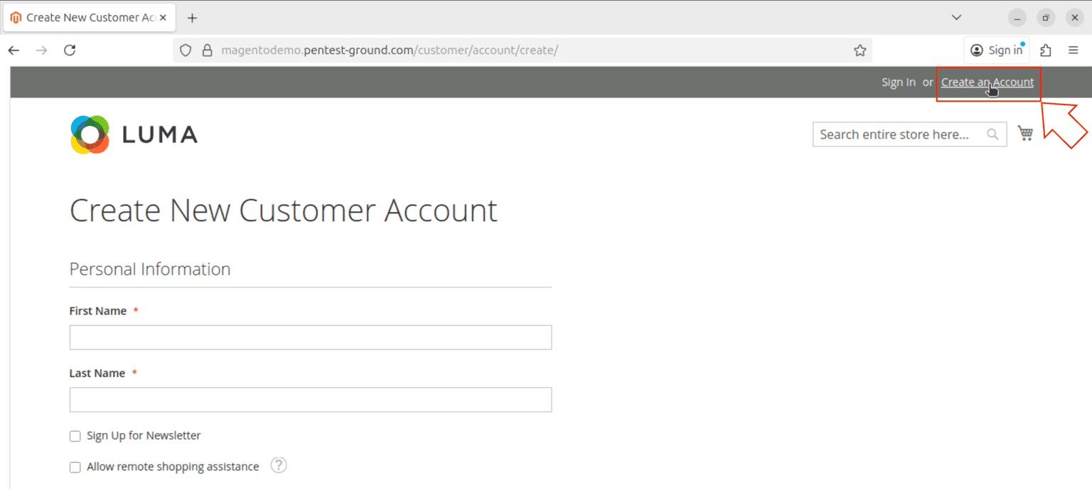 Since the vulnerable endpoint we’ll attack in step 4 requires customer-level authentication, our first step is to create a new customer user. Thankfully for us, 90% of all e-commerce websites depend on self-registration and creating an account before buying stuff. Therefore, this feature is enabled by default and open to anyone with a valid email address (or without one, if email verification is not enforced).