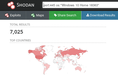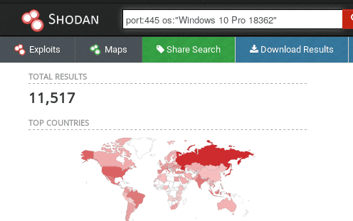Let’s take a look at Shodan for possible affected devices with SMB protocols exposed to the Internet, which are also running the vulnerable OS versions that we just mentioned.