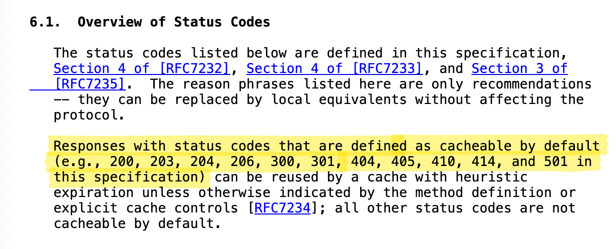 3. It has a final or heuristically cacheable status codes (e.g. 200, 203, 204, 206, 300, 301, 404, 410, 414,501)